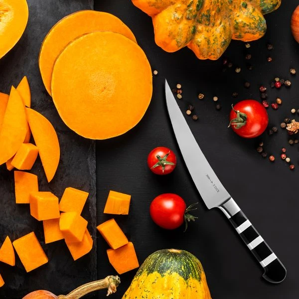 - Durch die geschwungene Klinge sind besonders lange und exakte Schnitte möglich. Ohne abzusetzen zerlegen sie Ihr Fleisch mühelos, entfernen Sehnen oder Fett